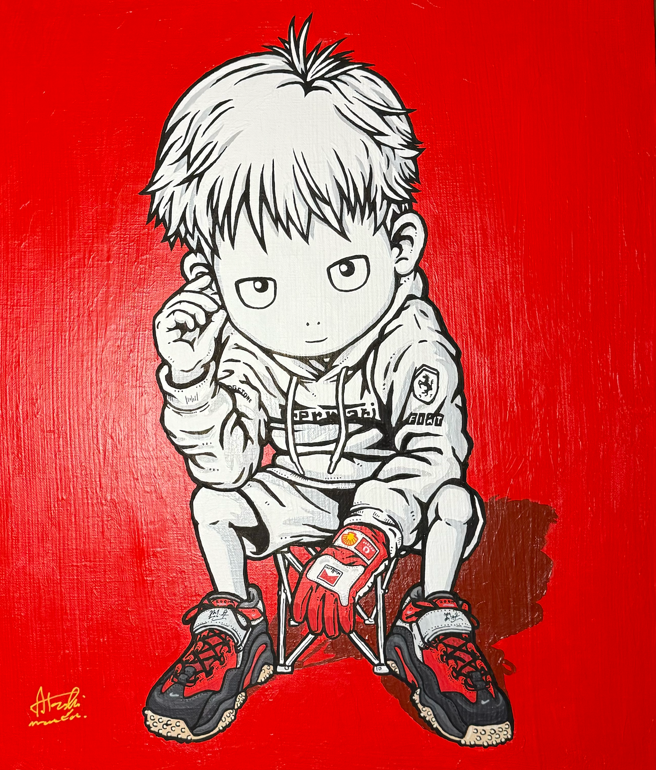 Atsushi Maeda/ 前田 純:学生時代バンド・デシネの影響を受けて細密漫画を描き、ゲーム企業のキャラクターデザイナー・アートディレクターを経て、2022年活動開始。白と黒の細密な線の少年たちはUIデザイン、販促デザインを極めた経験による合理的な企画として始まり、ストリートカルチャーに現代的ハードボイルドを融合させた独自スタイルでクール且つコミカルなストーリーを想起させる作風として注目を集めています。また、フリーハンドのライブドローパフォーマンスに強くこだわり、国内・海外の個展やグループ展に精力的に参加しています。