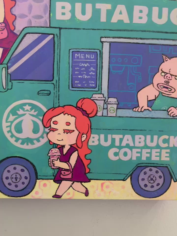 While grounded in the structure and form of traditional stories, I utilize pop characters and vibrant colors that break free from conventional narratives. My technique involves combining scenes from different timelines into a single canvas, resulting in a whimsical and humorously surreal worldview.