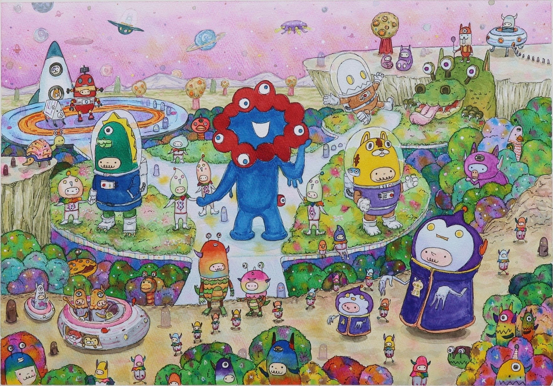 タイトル:「ミャクミャクとレンレン達、惑星探索旅行にて。」
