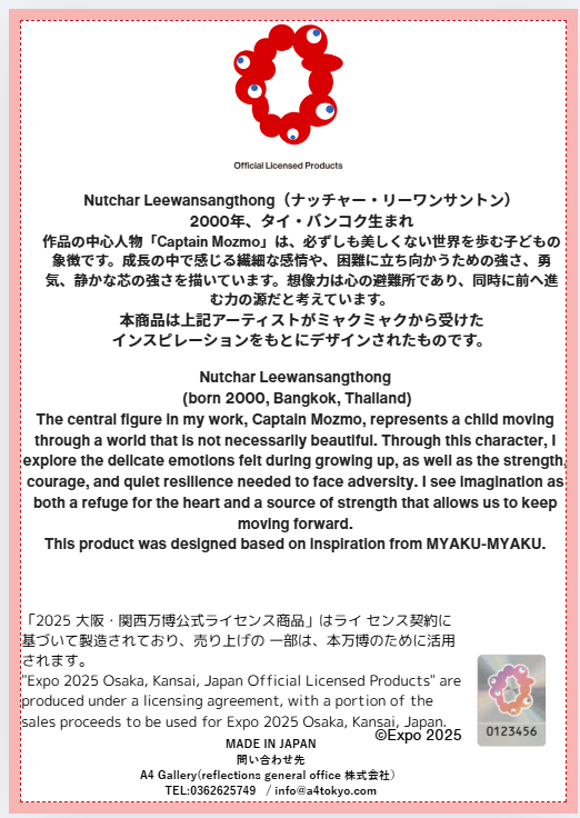 ผลงานศิลปะชิ้นนี้เป็น Expo 2025 Osaka, Kansai, Japan Official Licensed product ที่มีธีม MYAKU-MYAKU และงาน Expo ขึ้นอยู่กับผลงาน มีความเป็นไปได้ที่จะถูกจัดแสดงในงานนิทรรศการจนถึงวันปิดงาน Expo ในวันที่ 13 ตุลาคม 2025